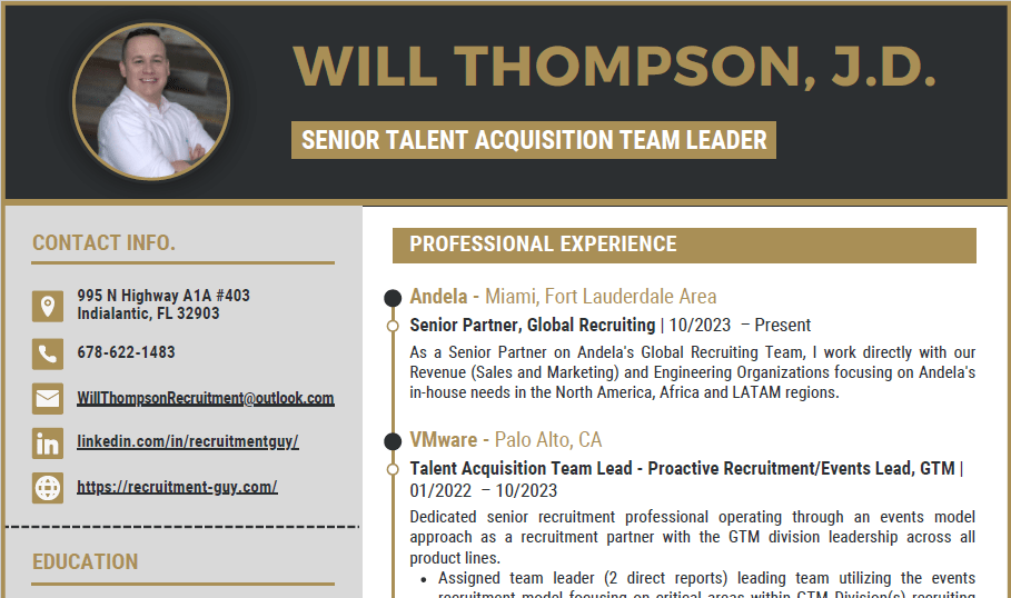 With over 10 years of experience in talent acquisition and recruitment, Will Thompson has helped place over a 1000 professionals into their career dream opportunities. He is a certified recruitment specialist (CRS), core recruitment professional (CRP), and LinkedIn recruiter professional (CLRP) and holds his Juris Doctorate (JD) in Employment Law. He is a published contributing author with articles in The Huffington Post, Recruiting Daily and The Undercover Recruiter.